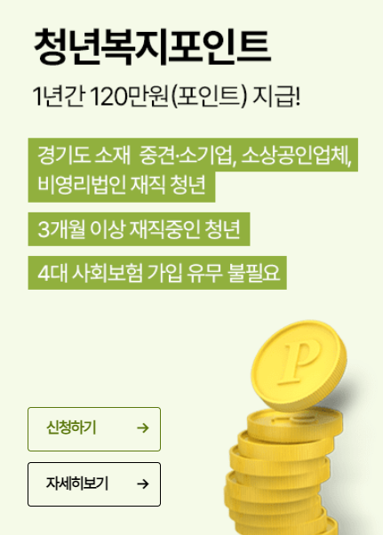 ๊ฒฝ๊ธฐ๋์ ๊ฑฐ์ฃผํ๋ ์ฒญ๋ ๋ค์ด ๊ฒฝ๊ธฐ๋ ๋ด ์ค์·์ค๊ฒฌ๊ธฐ์ , ์์๊ณต์ธ ์ ์ฒด, ๋น์๋ฆฌ๋ฒ์ธ ๋ฑ์์ 3๊ฐ์ ์ด์ ๊ทผ๋ฌดํ ๊ฒฝ์ฐ, ์ต๋ 120๋ง์์ ์ฒญ๋ ๋ณต์งํฌ์ธํธ๋ฅผ ๋ฐ์ ์ ์์ต๋๋ค.