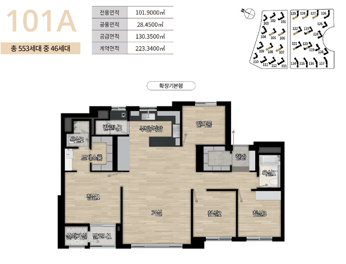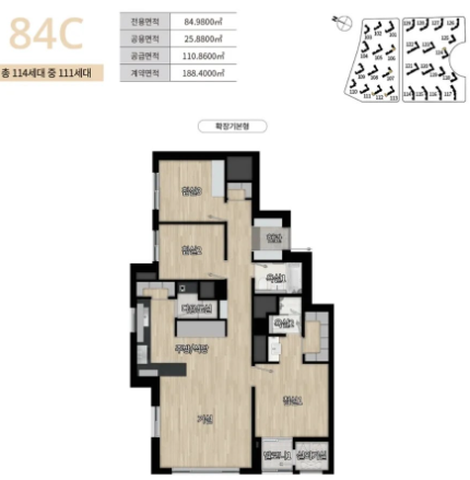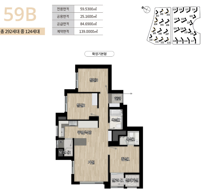 ์ A, B, C ์ธ ๊ฐ์ง๋ก ๊ตฌ์ฑ๋๋ฉฐ, ๋ฐฉ 3๊ฐ, ํ์ฅ์ค 2๊ฐ, ๋๋ ์ค๋ฃธ 1๊ฐ๊ฐ ํฌํจ๋ ๊ตฌ์กฐ์